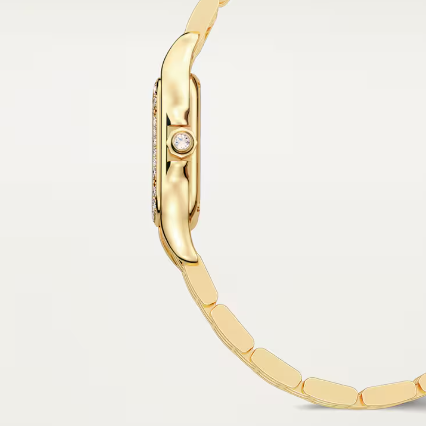 The dial of the Panthère de Cartier watch is a study in understated elegance, with a minimalist design that accentuates its inherent beauty. The golden hour markers and hands complement the lustrous gold case, creating a harmonious visual appeal that is both captivating and sophisticated.