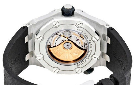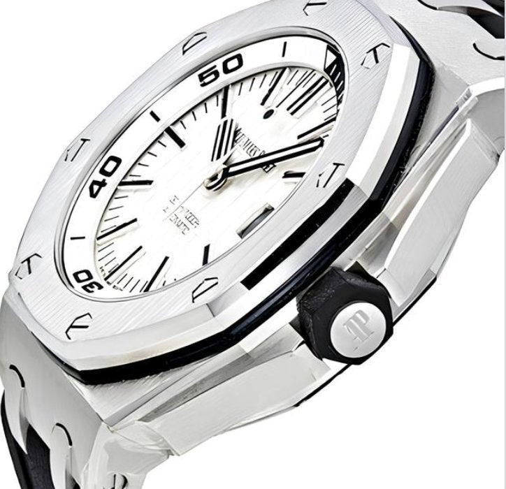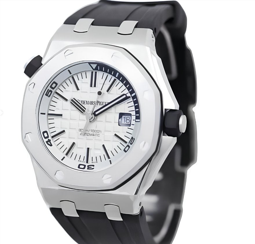 Stainless steel case with a black rubber strap. Fixed stainless steel bezel. Mega tapisserie pattern dial with luminous silver-tone hands and index hour markers. Minute markers around the outer rim. Dial Type: Analog. Luminescent hands and markers. Date display at the 3 o'clock position. Audemars Piguet calibre 3120 automatic movement with a 60-hour power reserve. Scratch resistant sapphire crystal. Screw down crown. Transparent case back. Case size: 42 mm. Case thickness: 14.10 mm. Octagon case shape. Tang clasp. Water resistant at 300 meters / 1000 feet. Functions: date, hour, minute, second. Additional Info: diving scale and zone from 60 to 15 minutes in black.