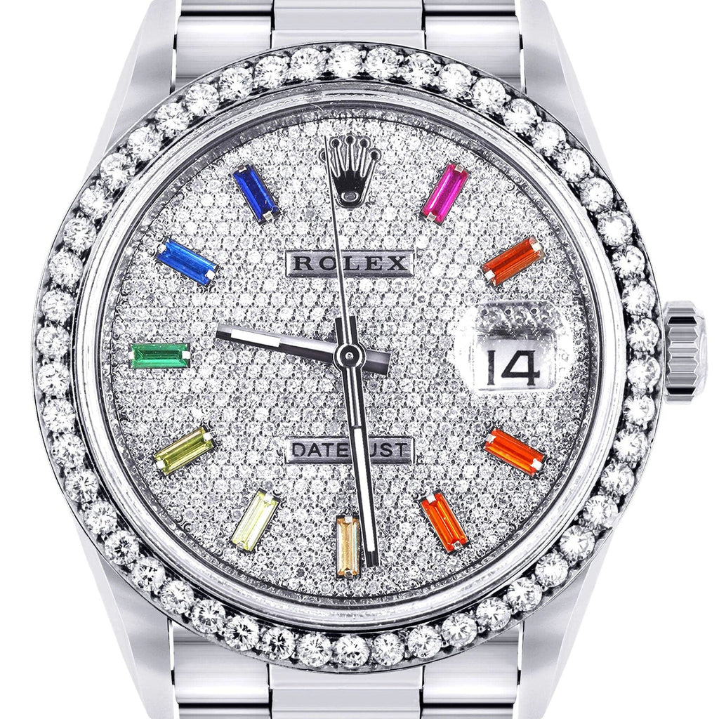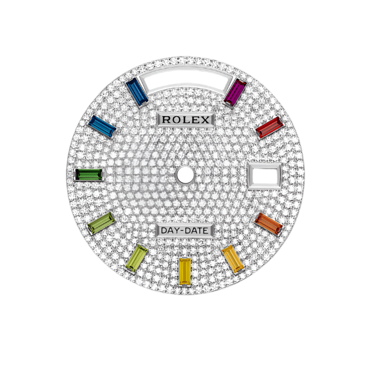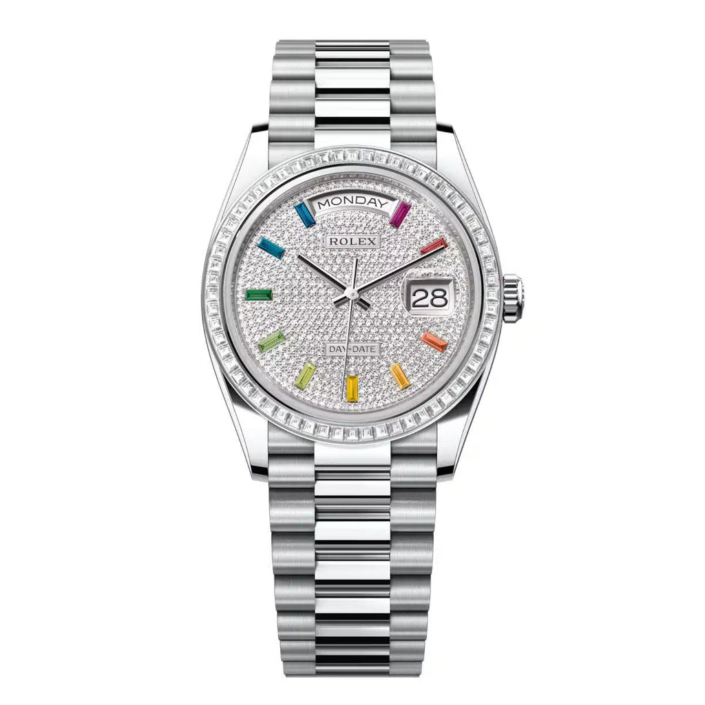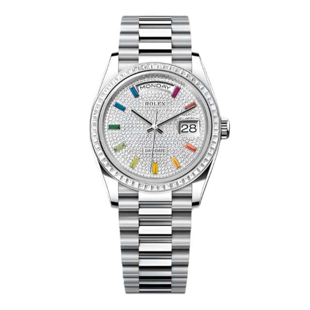 Introducing the Rolex Day-Date 36mm Pave Dial Crystal Bracelet Reference 128399TBR . Crafted by expert artisans with precision and luxury in mind, this remarkable timepiece features a stunning pave dial and crystal bracelet. With its elegant design and impeccable craftsmanship, this watch will make a sophisticated statement on your wrist.