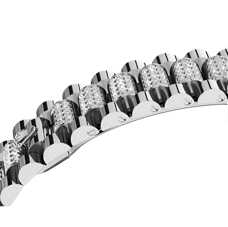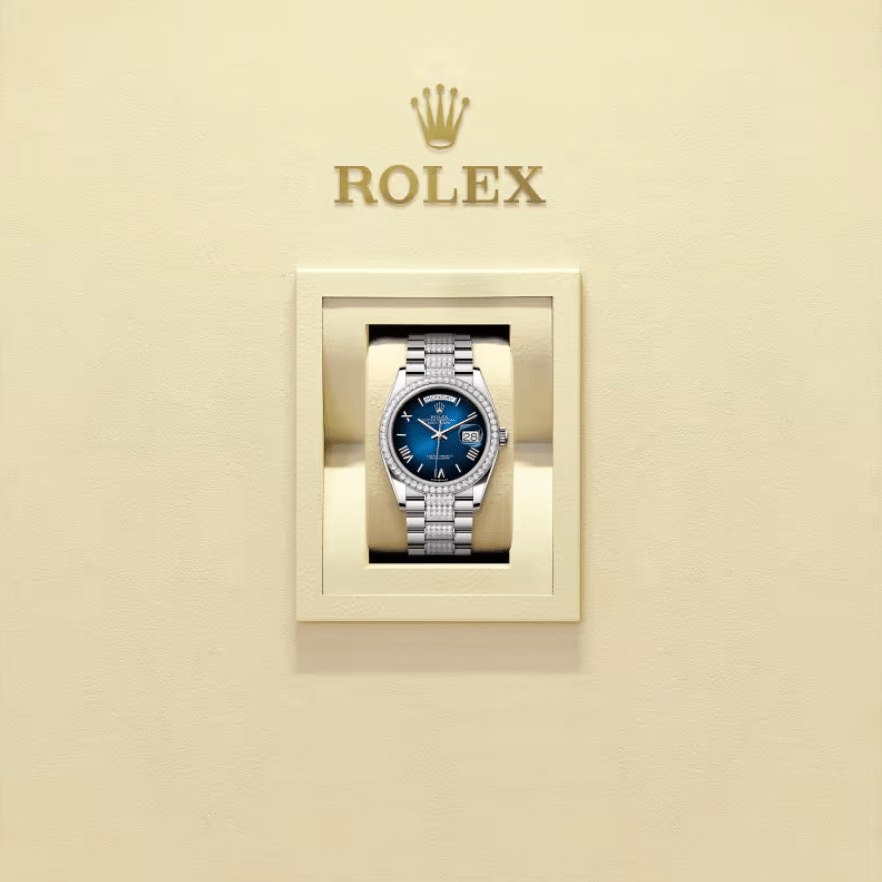 The Rolex Day-Date 36 Oyster Timepiece, crafted from luxurious white gold and adorned with sparkling diamonds, boasts a 36 mm case for a bold and elegant statement. Perfect for the sophisticated individual seeking a timepiece that exudes excellence and prestige.