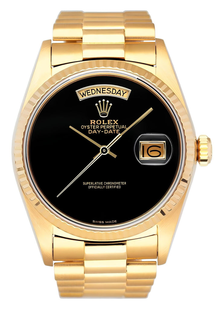 Day-date president 18038. this 1987 model features an iconic black onyx dial and an exceptional gold finish that exudes power and class. the president bracelet and cal. 3055 perpetual movement add to its elegance and functionality. own a piece of presidential fashion today.