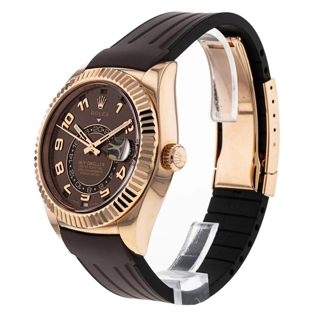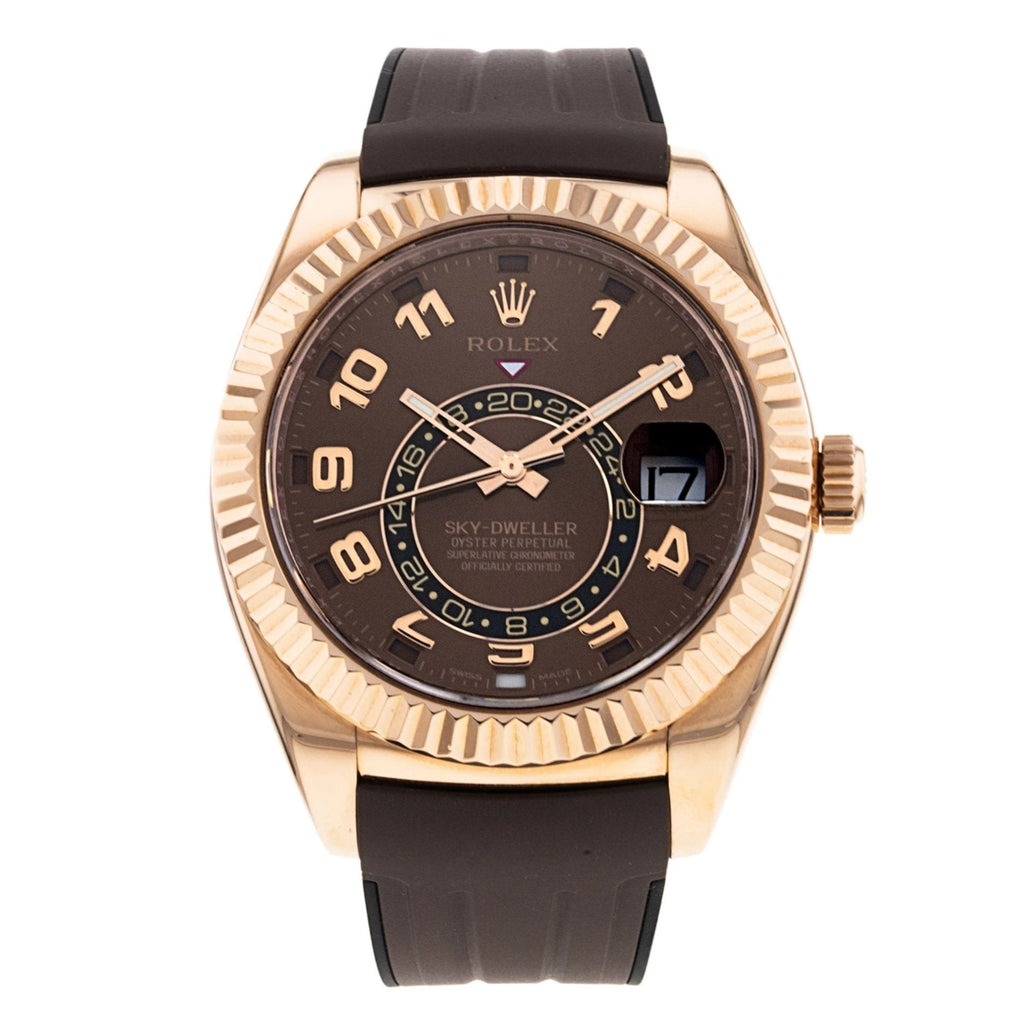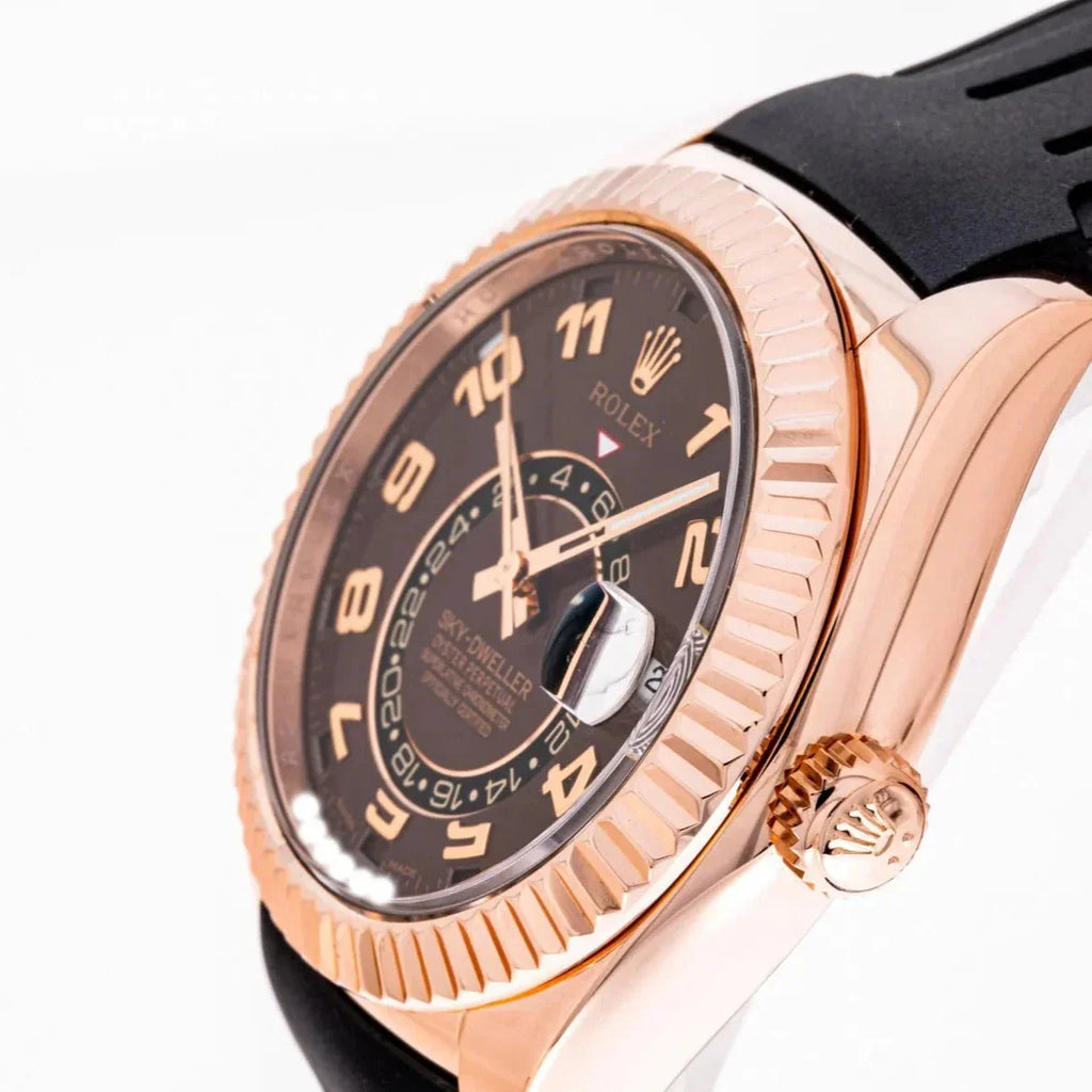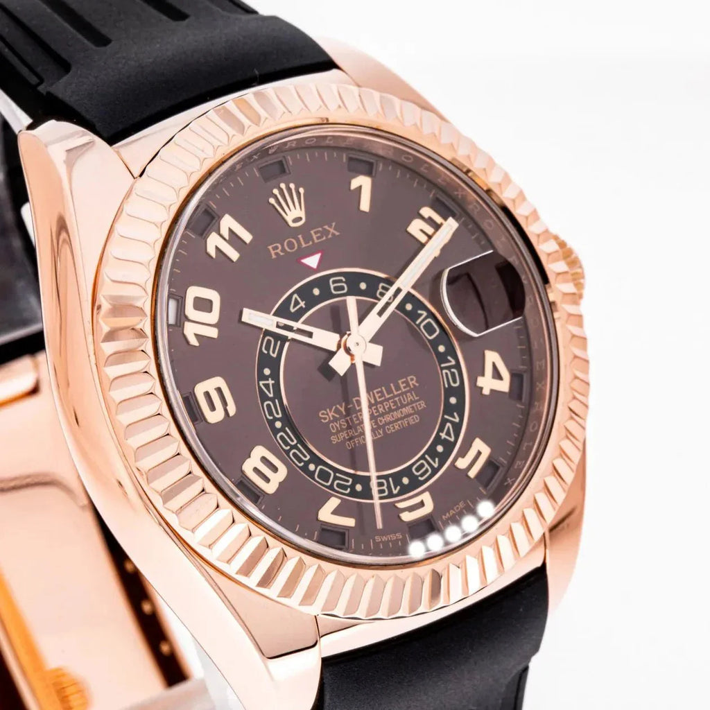 The Rolex Sky-Dweller is a timepiece designed for those seeking both style and durability. Its sleek brown rubber strap provides comfort and versatility, while the iconic Rolex name and precision movement guarantee quality and reliability. With this watch, you'll effortlessly elevate any outfit to a new level of sophistication.